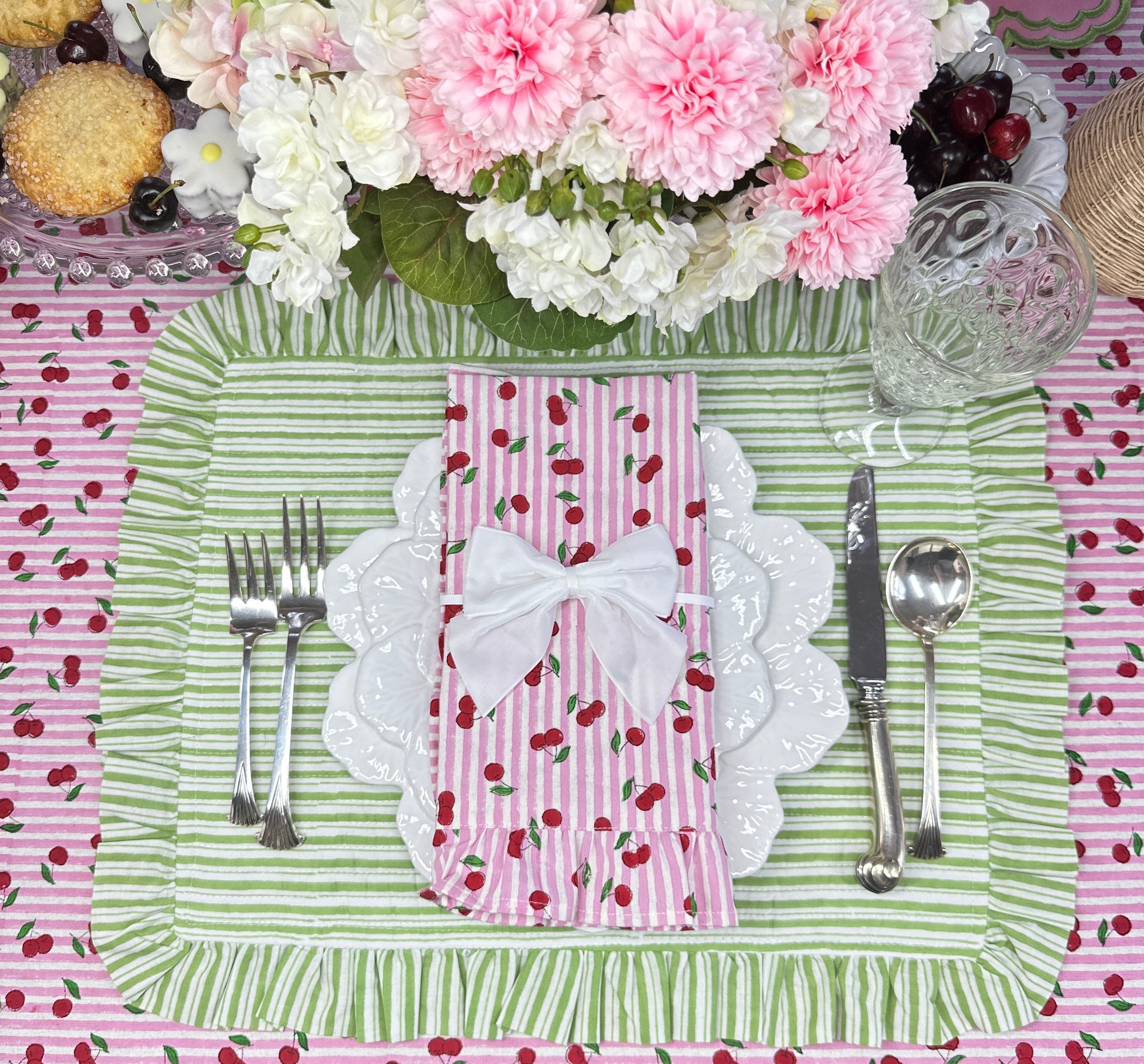 Set your table with with delicate pink stripes and handfuls of joyful red cherries.