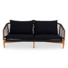 Nilo sofa showcases the traditional Lloyd Loom technique set against a contemporary teak wood frame. Over time, this gorgeous wood turns into a darker patina which looks all the more stunning contrasted against the black fabric upholstery of this versatile design. Easy-to-wash removable cushions keep this outdoor sofa bright, beautiful and ready for the sun.